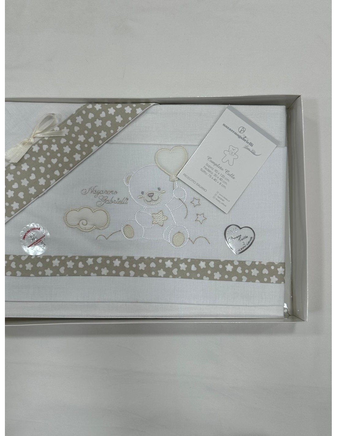 Completo culla neonato ricamato 3 pezzi in cotone, Nazareno Gabrielli;