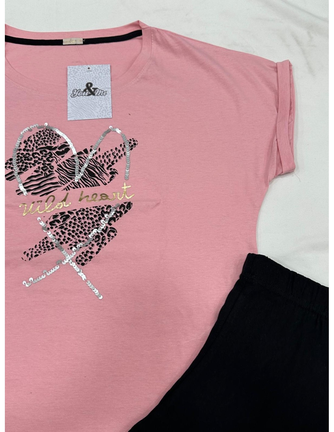 Cipria e nero: Maglia color cipria con cuore argento e nero e scritta "SWEET HEART", abbinata a pantaloncino corto color nero.