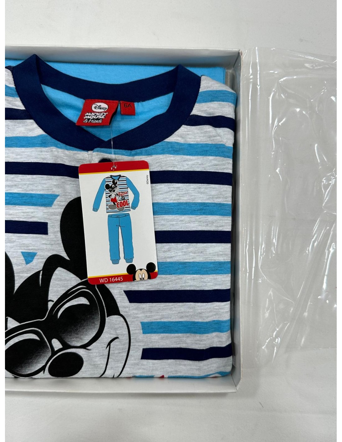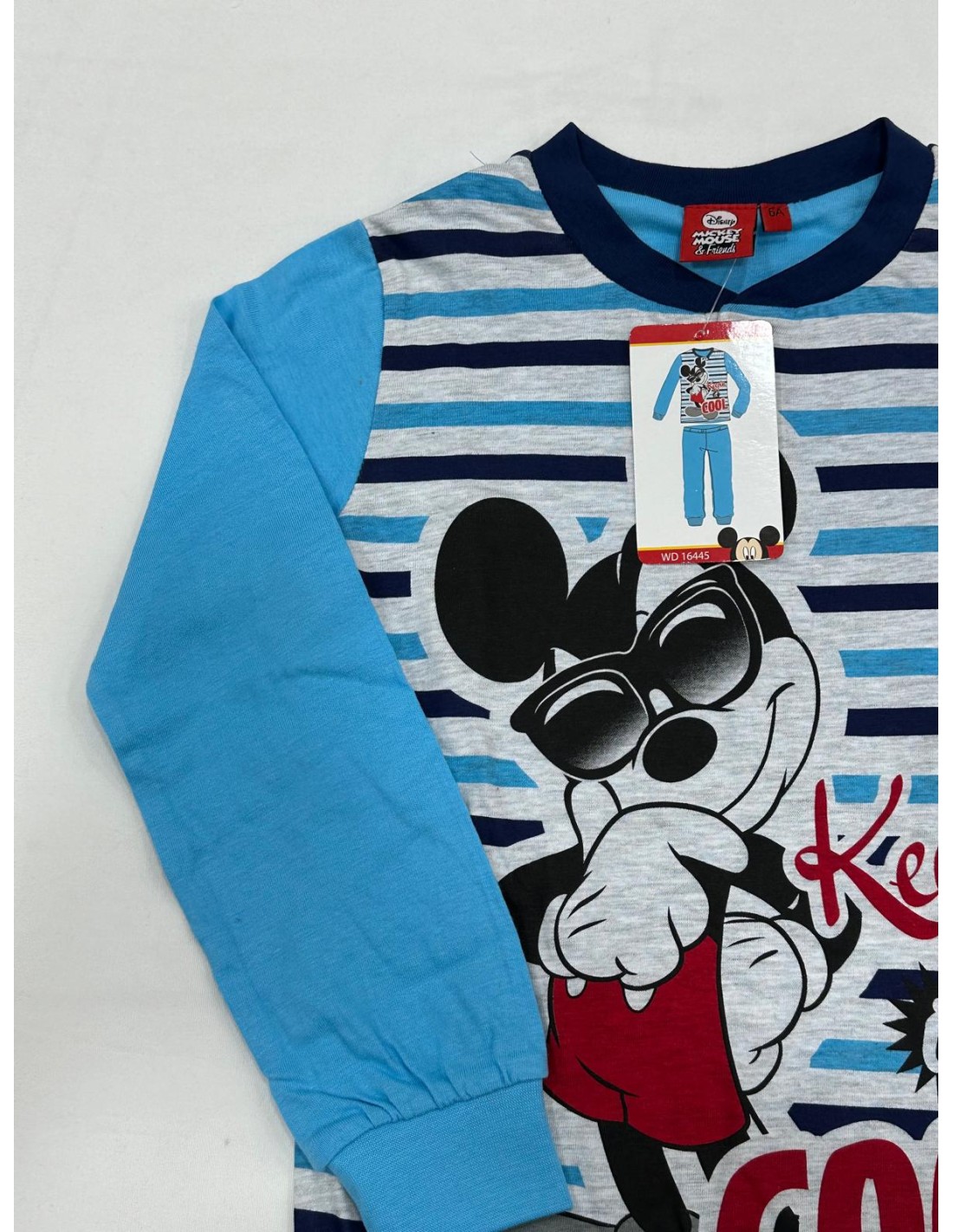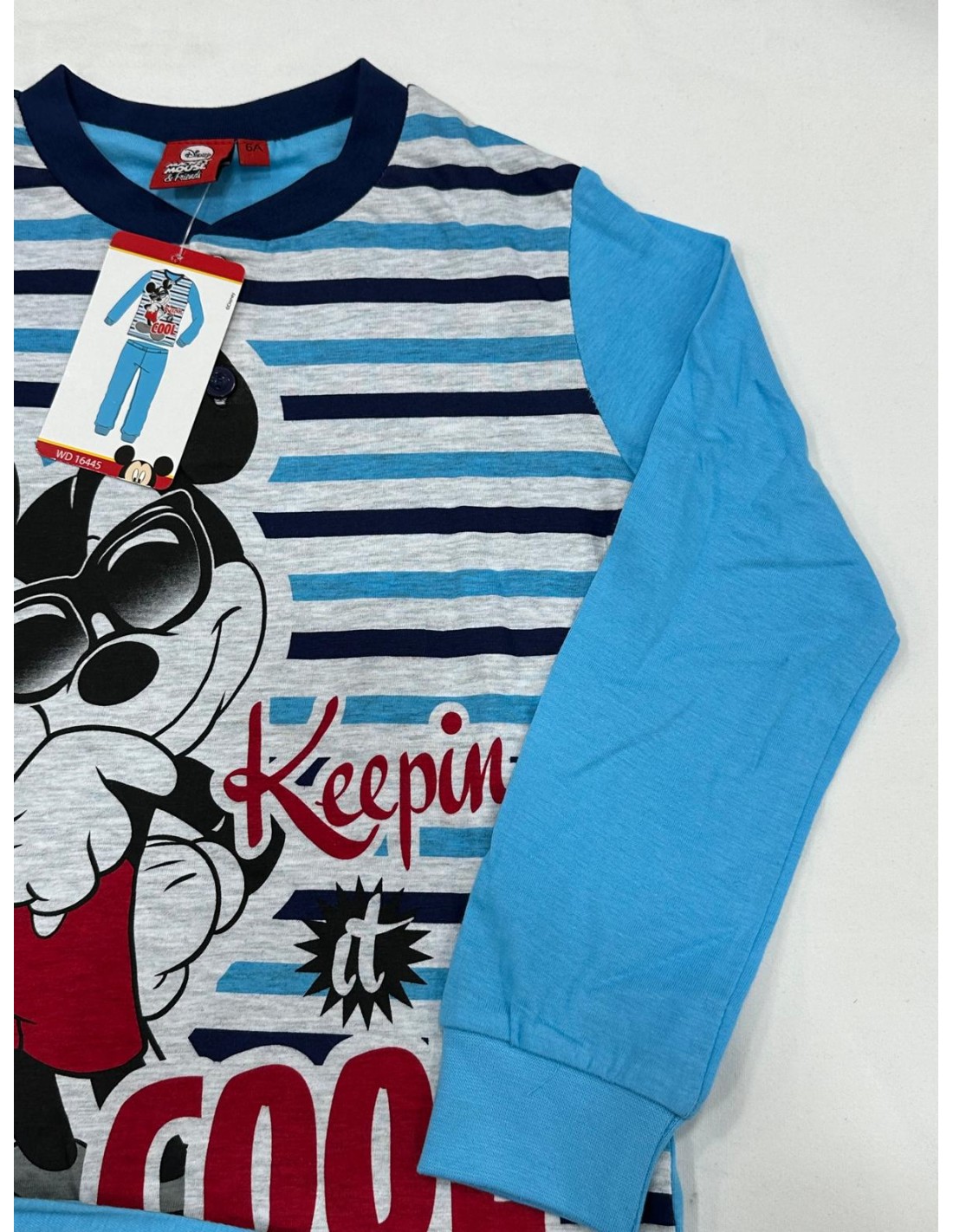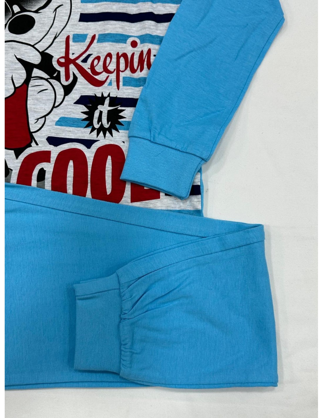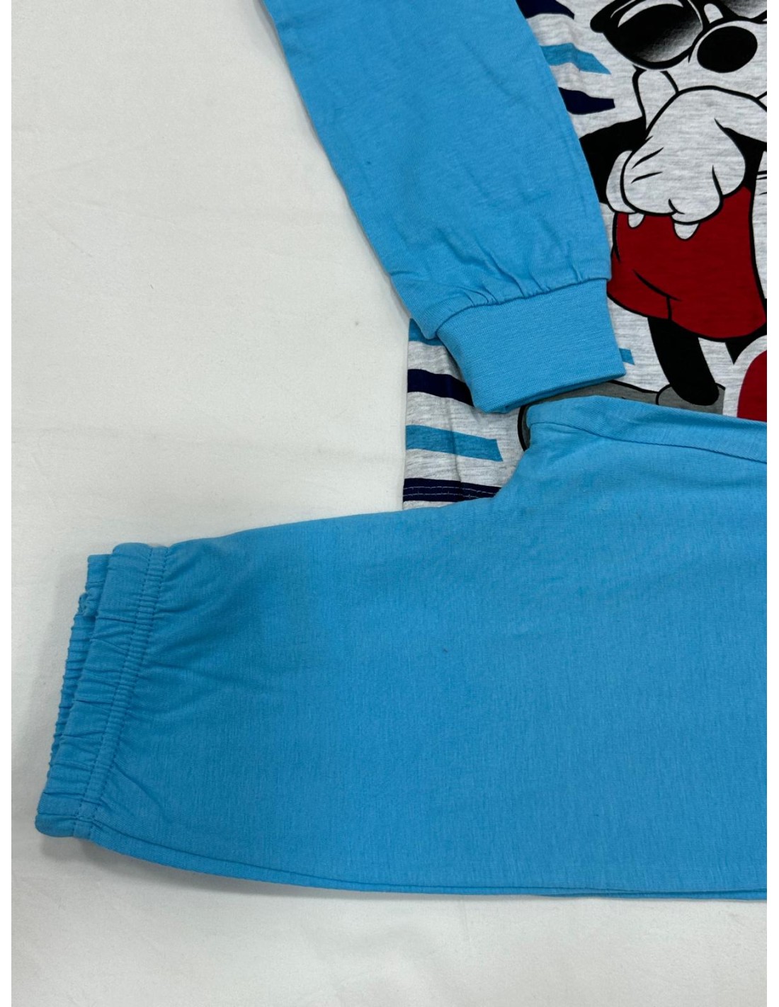 2) maglia a righe blu scuro, celeste con fondo grigio e stampa di Topolino, bottoni a serafino, bordo raso gola color blu scuro, maglia con manica lunga color celeste e polsino, pantalone tinta unita color celeste con polsino.